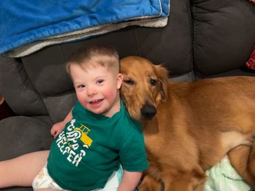 Recently, he had a blast meeting some of his parents' friends' new puppies. His big, bright smile always wins over everyone he meets. This fall, he will be dressing as a cow for Halloween to greet the trick or treaters!
